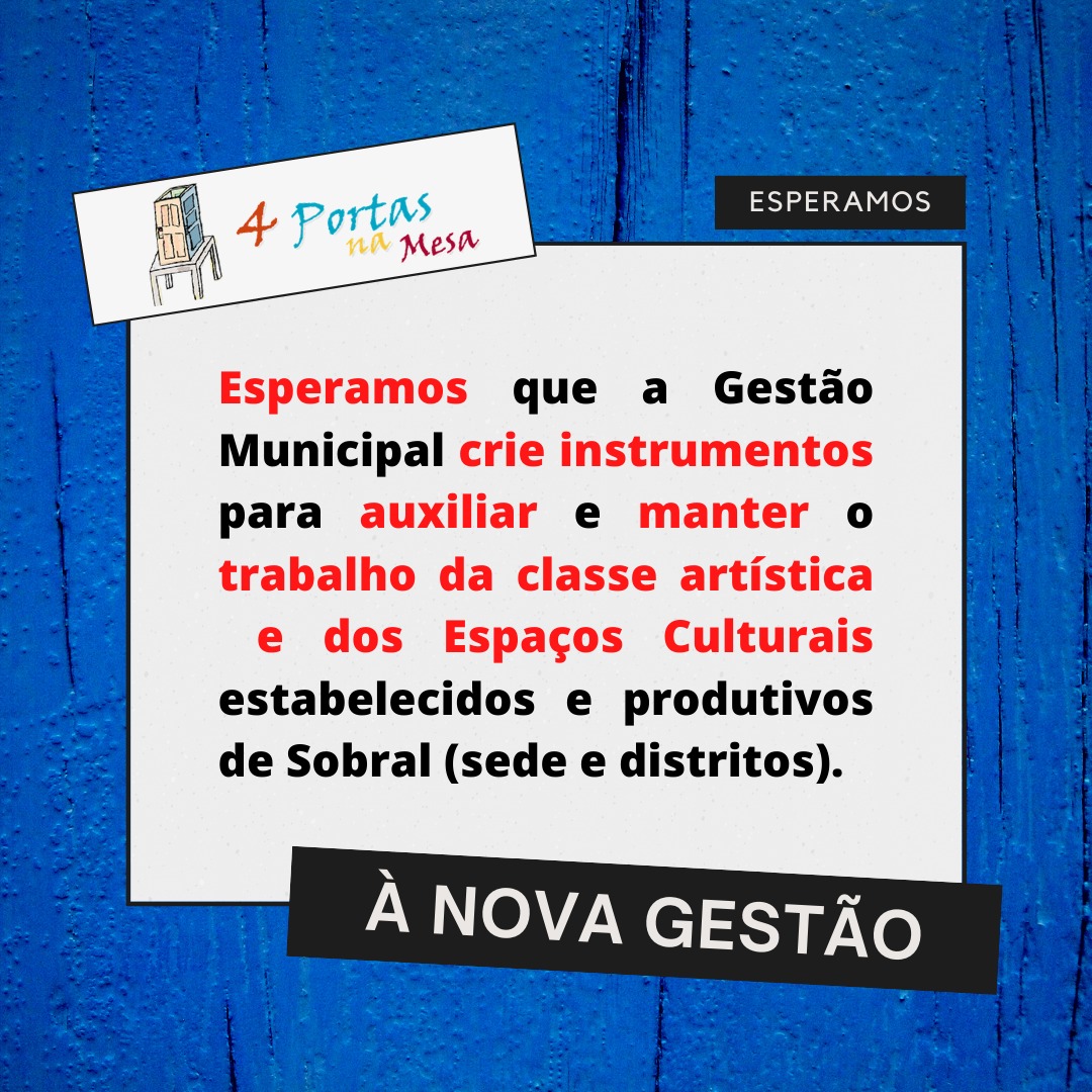 A 4 Portas na Mesa surgiu da reunião de um grupo de amigos no Rio de Janeiro (professores, atores e fotógrafos). Desde 2004, Chico Expedito participa ativamente no movimento teatral em Sobral, ocasião em que montou com elenco sobralense o espetáculo "Esperando Godot" que reinaugurou o Teatro São João. De lá pra cá, sempre esteve em Sobral ministrando cursos, oficinas, etc. Com todo potencial artístico existente em Sobral, porque não realizar um sonho antigo? O de montar a sua própria casa de produção, e a partir dela criar a sua Escola Livre de Teatro, realização quase impossível no Rio de Janeiro.Em 2014 se transfere para Sobral e nesse mesmo ano a casa começa a funcionar. Sua inauguração oficial foi em julho de 2015 com o evento 4 Dias na 4 Portas que envolvia todas as correntes artísticas existentes na cidade: Música, Artes Plásticas, Dança e Teatro. A 4 Portas na Mesa sempre teve a preocupação de fortalecer e dignificar os artistas locais e vai continuar assim.