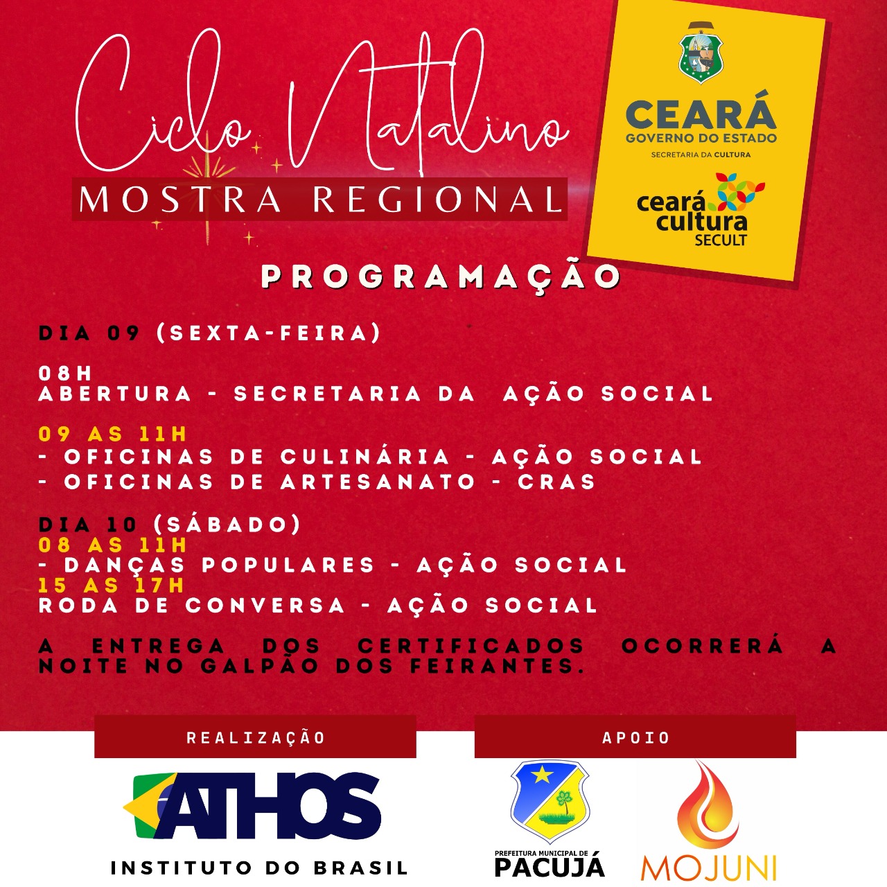 A programação será composta de grupos folclóricos, cujas manifestações são ligadas ao ciclo natalino. A realização deste projeto é uma forma de promovermos visibilidade ao patrimônio cultural imaterial do município de Pacujá e da Região Norte do Estado do Ceará, assim como, fomentar a valorização destes bens (patrimônio material e imaterial do povo brasileiro) pela população local e regional, colaborando com o desenvolvimento de pertença e da identidade que permeia gerações de pacujaenses e estimulando a economia criativa local.