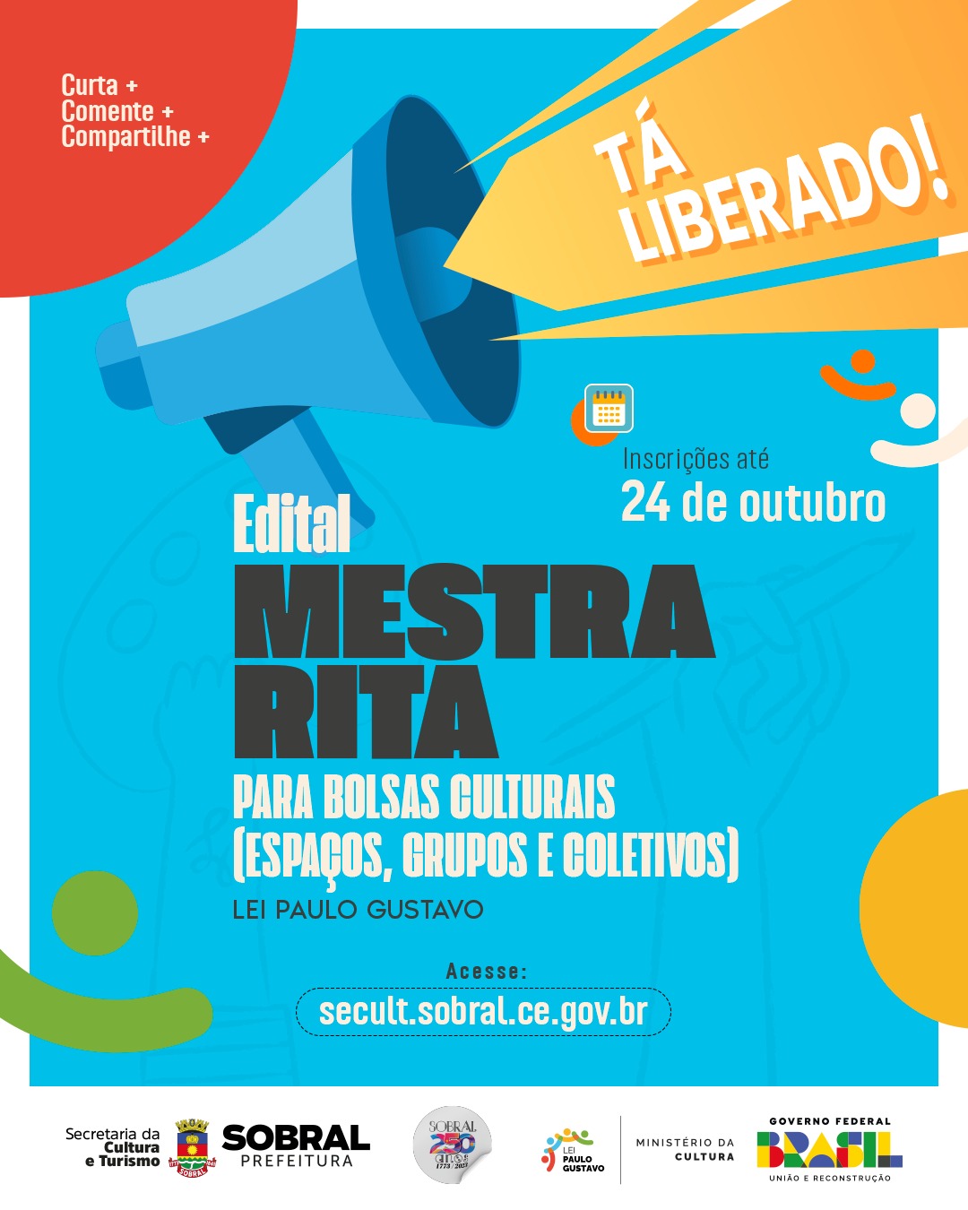 O Edital Mestra Rita para Bolsas Culturais tem por objetivo SELECIONAR PROJETOS DE ESPAÇOS, GRUPOS E COLETIVOS ARTÍSTICOS-CULTURAIS PARA RECEBEREM BOLSAS CULTURAIS COM RECURSOS DA LEI COMPLEMENTAR N° 195/2022 (LEI PAULO GUSTAVO) para pesquisa, promoção, difusão, circulação, intercâmbio e residência cultural para Espaços e Grupos artístico-culturais independentes, com objetivo de incentivar a produção cultural do município de Sobral. Este Edital é realizado com recursos do Governo Federal repassados por meio da Lei Complementar nº 195/2022 - Lei Paulo Gustavo.